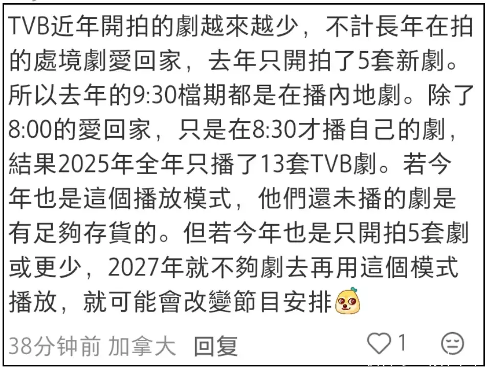 网友掐指一算,TVB自制剧现有存货只够播放到2027年,还是同时播出其他平台剧集和老剧的前提下,和亚视倒闭之前的情况几乎一模一样。