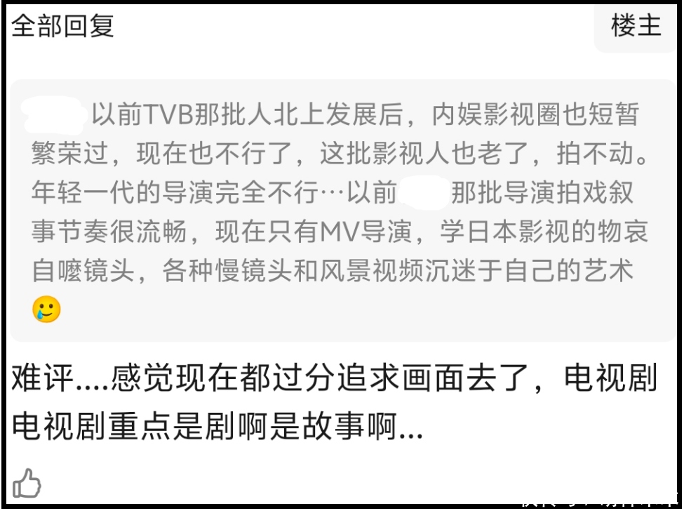 正如网友所说,优秀幕后人才流失是影视行业真正的痛点,不仅仅发生在TVB,整个内娱都是一样的,提起来就是没有好故事、没有好编剧,人人都明白,人人都不知道如何解决,或者说无法解决。