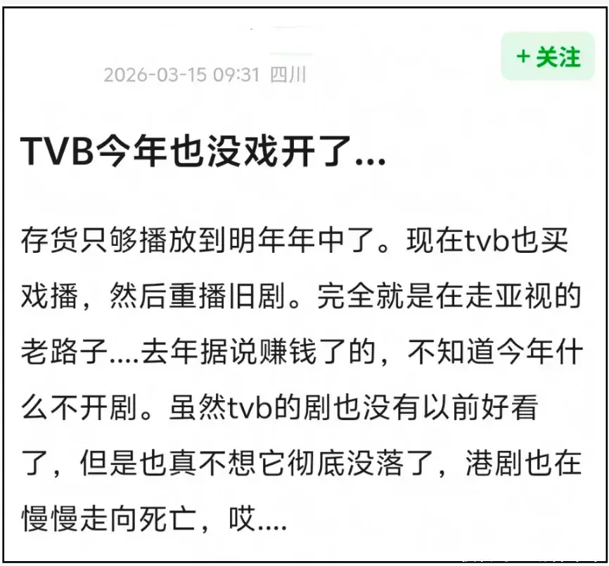 人无远虑,必有近忧啊!原来是网友发现,2026年都过去3个多月了,TVB还没有开拍哪怕一部新剧。